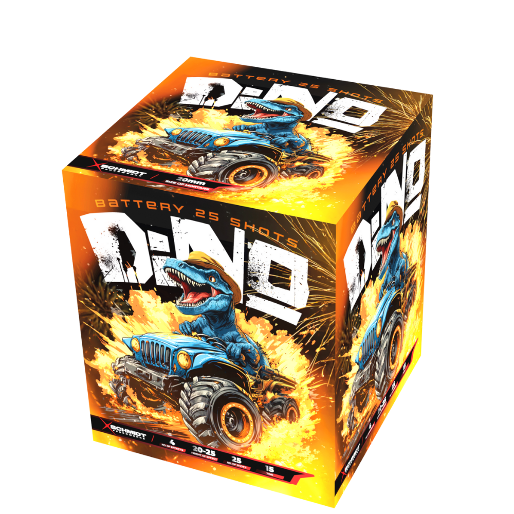 Kompaktní ohňostroj Dino je doprovázený různými efekty. Tento ohňostroj do vzduchu vypálí 25 ran ráže 20 mm, celá show trvá 25 vteřin.