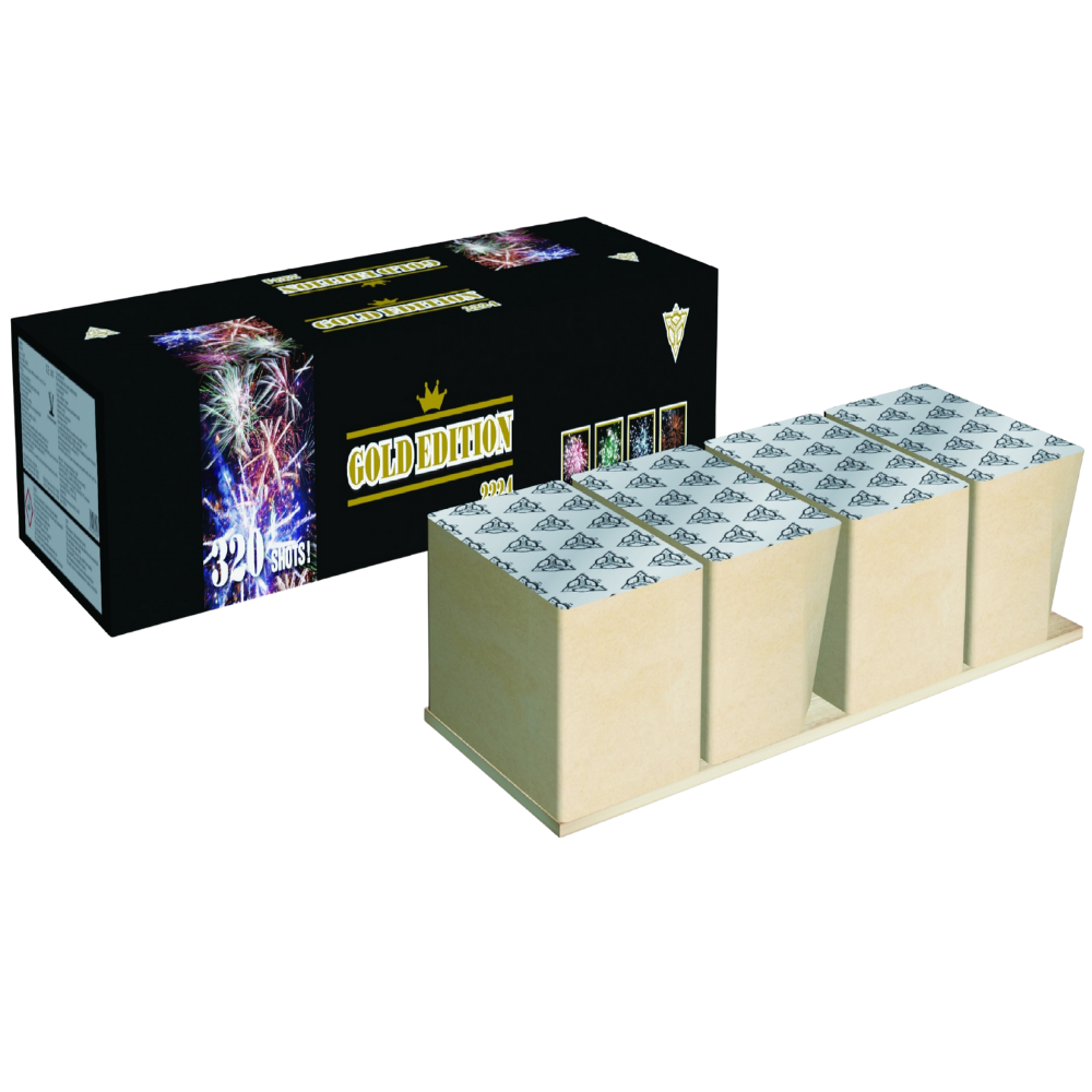 Kompaktní ohňostroj Gold Edition 2224g je doprovázený mnohými různobarevnými efekty. Do vzduchu vypálí 320 ran ráže 20 mm, celá show trvá 200 vteřin.