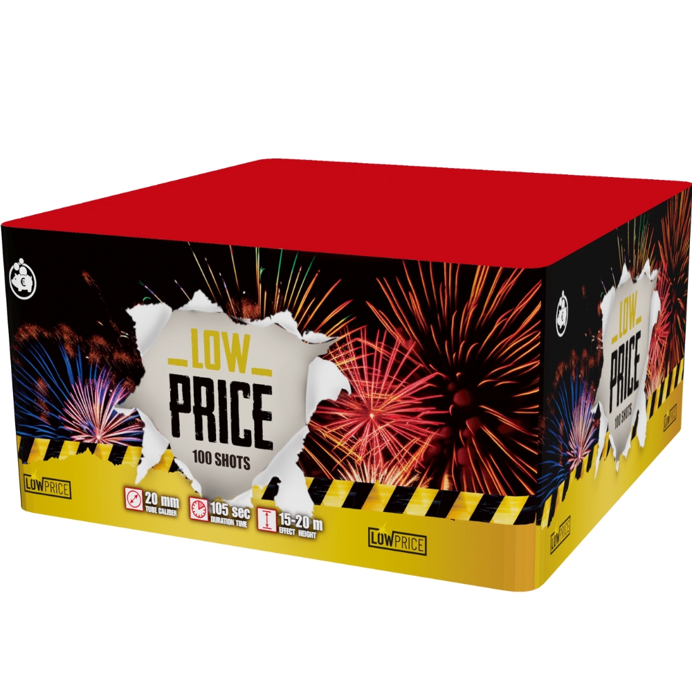 Kompaktní ohňostroj Low price je doprovázený mnoha různobarevnými efekty. Do vzduchu vypálí 100 ran ráže 20 mm, celá show trvá 105 vteřin.