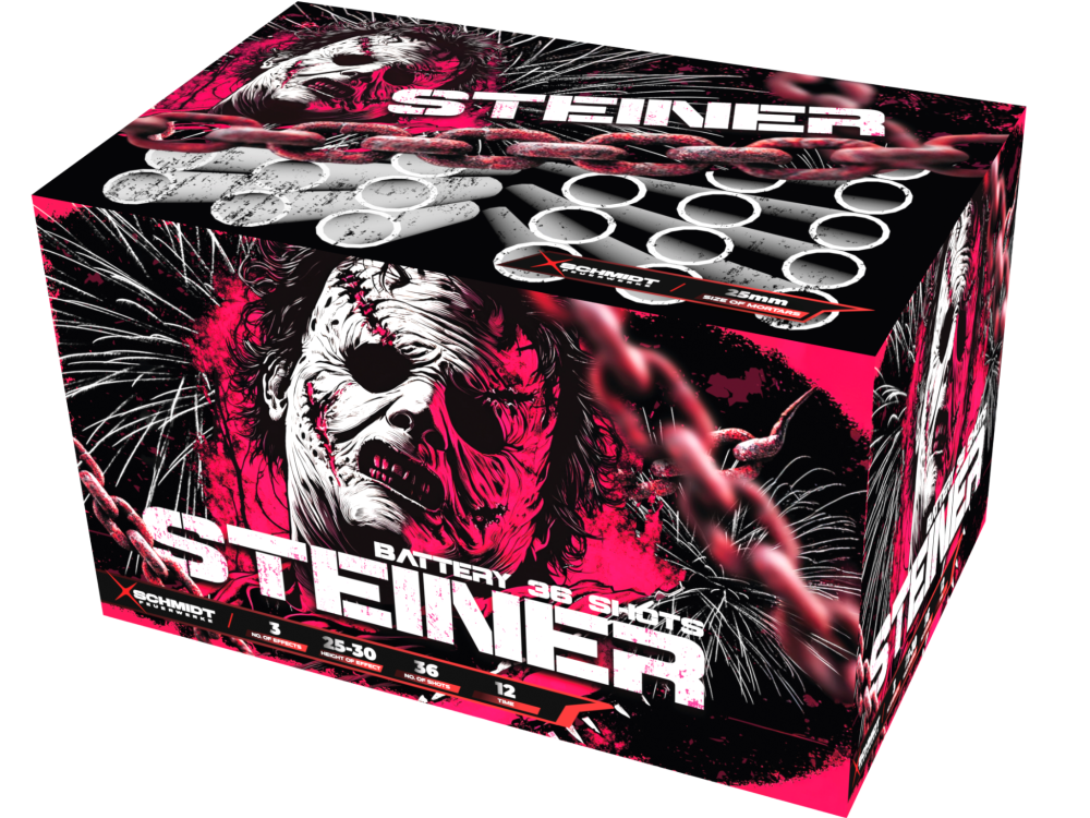 Kompaktní ohňostroj Steiner je doprovázený různými efekty. Tento ohňostroj do vzduchu vypálí 36 ran ráže 25 mm, celá show trvá 15 vteřin.