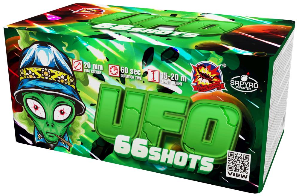 Kompaktní ohňostroj UFO je doprovázený mnoha různobarevnými efekty. Do vzduchu vypálí 66 ran ráže 20 mm, celá show trvá 60 vteřin.