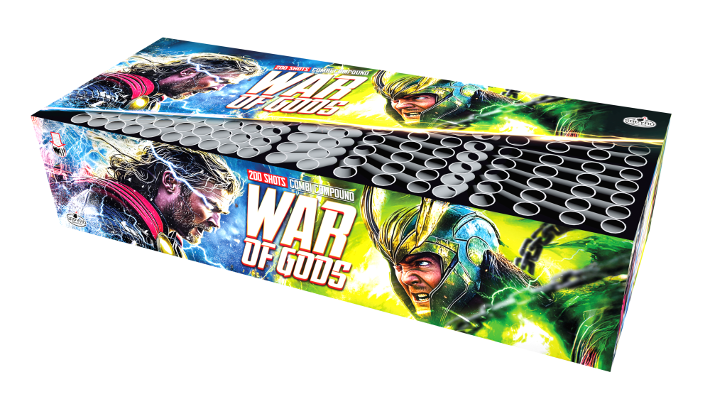 Kompaktní ohňostroj War of Gods je doprovázený různobarevnými efekty. Do vzduchu vypálí 200 ran kalibru 38 mm, kombinace směru výmetu - rovná s vějířem.