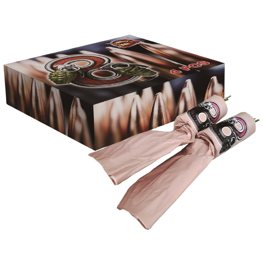 Toto balení zábavní pyrotechniky obsahuje 4 kusy petard se zápalnou šňůrou s rozměrem: 3,6x8,5x3 cm.